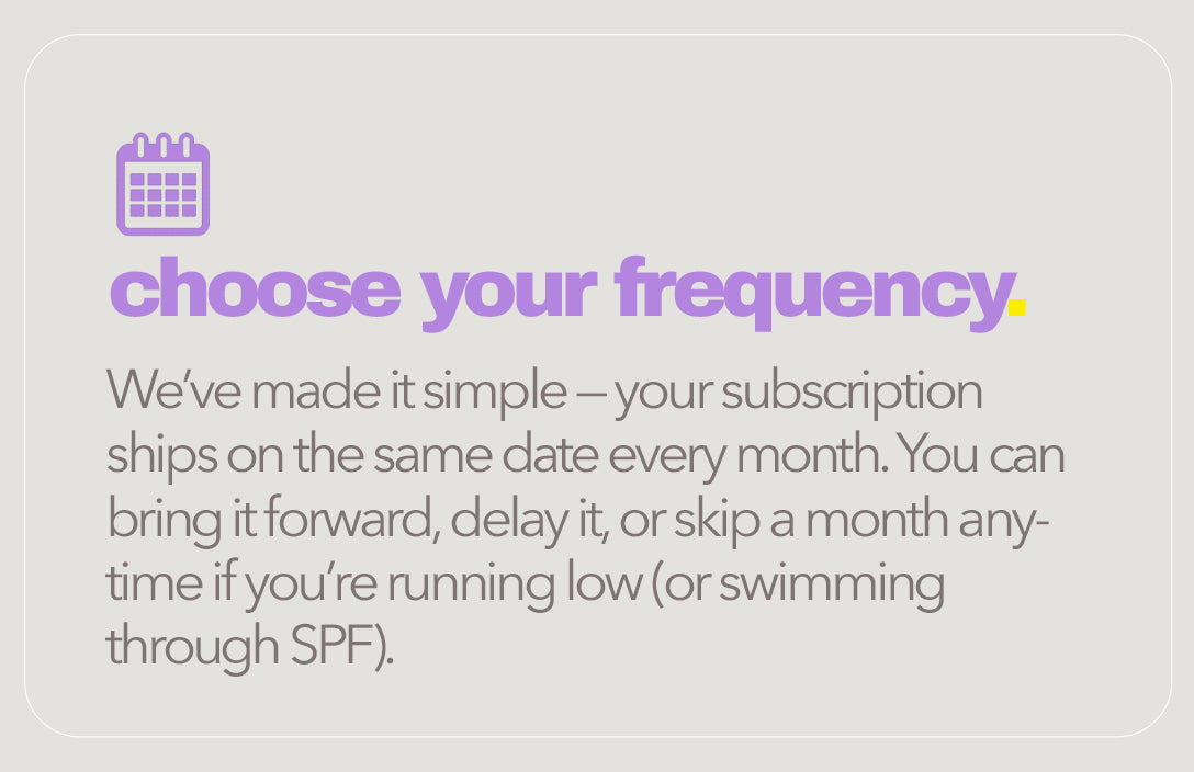 Make life easy. Set your routine once, and we’ll keep the SPF coming. No running out, no last-minute dashes to the shop — just nice cream showing up exactly when you need it. Save time, save money, stay sun-ready. ☀️
