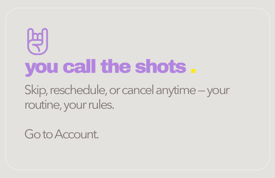 Too easy. Just log into your subscription account and update your details anytime before your next payment is processed — shipping address, payment method, ship date, all of it.